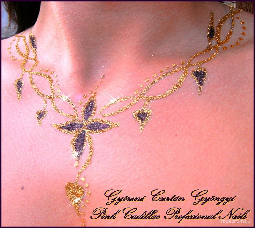 A fent látható "Csillámtetoválás szabadkézzel" elnevezésű műköröm minta Gyöngyi Györené Csertán, Veresegyházi műkörmös munkája. A kép 2012-05-01 16:51:27-kor került feltöltésre a Hennafestés, testfestés kategóriába sorolva, mely immáron 307 db Elite körömszalon által feltöltött köröm mintát tartalmaz. A kategóriában szereplő további műköröm minták megtekinthetőek a mukorom.hu weboldalon.