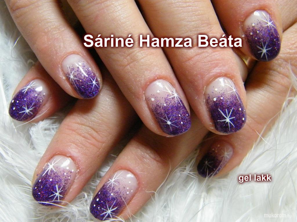 A fent látható "zselés lakkozás" elnevezésű műköröm minta Sáriné Hamza Beáta (Baross Beauty Szalon), Budapest 20. ker.i műkörmös munkája. A kép 2012-12-19 21:51:31-kor került feltöltésre a Gél Lakk kategóriába sorolva, mely immáron 16634 db Elite körömszalon által feltöltött köröm mintát tartalmaz. A kategóriában szereplő további műköröm minták megtekinthetőek a mukorom.hu weboldalon.