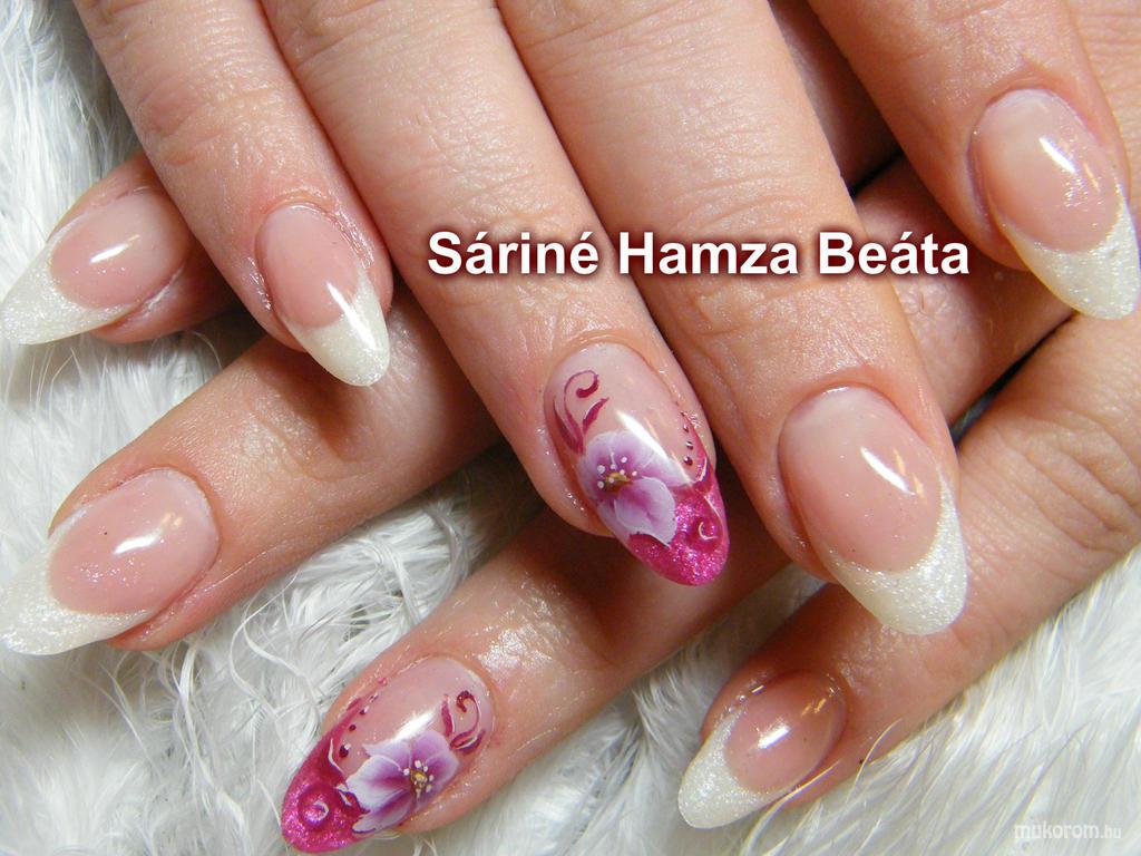 A fent látható "francia virággal" elnevezésű műköröm minta Sáriné Hamza Beáta (Baross Beauty Szalon), Budapest 20. ker.i műkörmös munkája. A kép 2012-12-27 21:53:48-kor került feltöltésre a Zselés műköröm képek kategóriába sorolva, mely immáron 40450 db Elite körömszalon által feltöltött köröm mintát tartalmaz. A kategóriában szereplő további műköröm minták megtekinthetőek a mukorom.hu weboldalon.