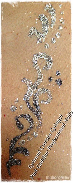 A fent látható "Csillám tetoválás szabadkézzel" elnevezésű műköröm minta Gyöngyi Györené Csertán, Veresegyházi műkörmös munkája. A kép 2013-08-06 20:57:26-kor került feltöltésre a Hennafestés, testfestés kategóriába sorolva, mely immáron 307 db Elite körömszalon által feltöltött köröm mintát tartalmaz. A kategóriában szereplő további műköröm minták megtekinthetőek a mukorom.hu weboldalon.