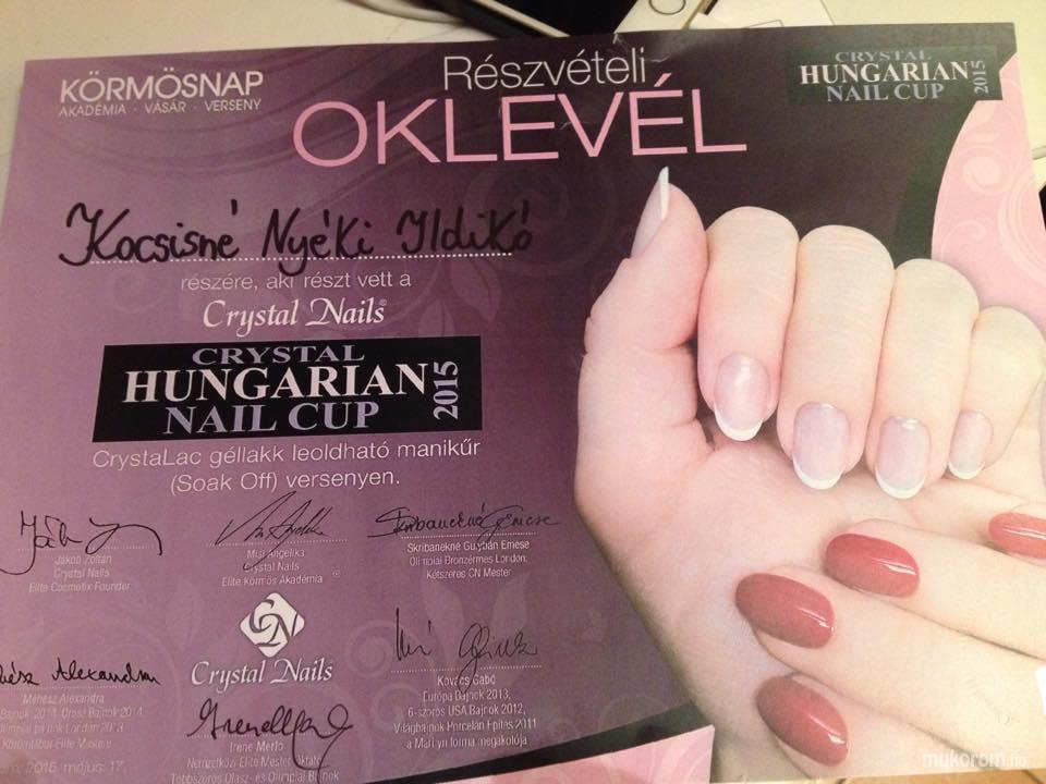 A fent látható "Géllakk versenyen" elnevezésű műköröm minta Kocsisné Nyéki Ildikó, Szigetszentmiklósi műkörmös munkája. A kép 2015-05-19 09:12:28-kor került feltöltésre a Képek rólam kategóriába sorolva, mely immáron 571 db Elite körömszalon által feltöltött köröm mintát tartalmaz. A kategóriában szereplő további műköröm minták megtekinthetőek a mukorom.hu weboldalon.