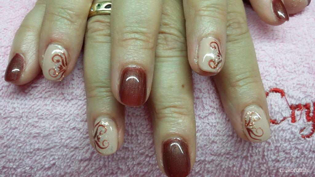 A fent látható "kacskaringós " elnevezésű műköröm minta Takács Gabi, Budapest 4. ker.i műkörmös munkája. A kép 2015-11-30 20:48:27-kor került feltöltésre a Zselés műköröm képek kategóriába sorolva, mely immáron 40450 db Elite körömszalon által feltöltött köröm mintát tartalmaz. A kategóriában szereplő további műköröm minták megtekinthetőek a mukorom.hu weboldalon.