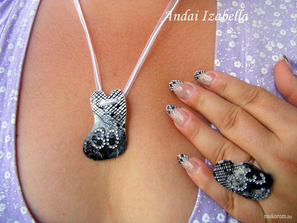 A fent látható "Adrinak" elnevezésű műköröm minta Andai Izabella, Hatvani műkörmös munkája. A kép 2011-08-03 23:11:00-kor került feltöltésre a Ékszerek kategóriába sorolva, mely immáron 610 db Elite körömszalon által feltöltött köröm mintát tartalmaz. A kategóriában szereplő további műköröm minták megtekinthetőek a mukorom.hu weboldalon.
