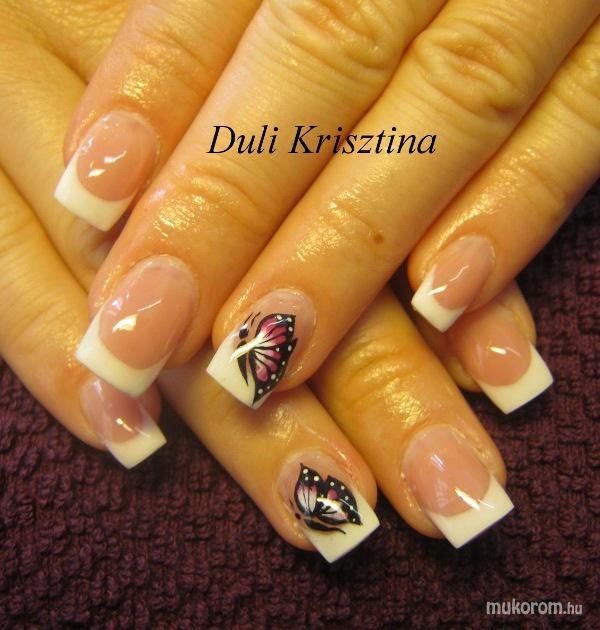 A fent látható "Francia pillangóval" elnevezésű műköröm minta Duli Krisztina, Budapest 10. ker.i műkörmös munkája. A kép 2011-09-11 13:57:26-kor került feltöltésre a Francia köröm minták kategóriába sorolva, mely immáron 3055 db Elite körömszalon által feltöltött köröm mintát tartalmaz. A kategóriában szereplő további műköröm minták megtekinthetőek a mukorom.hu weboldalon.